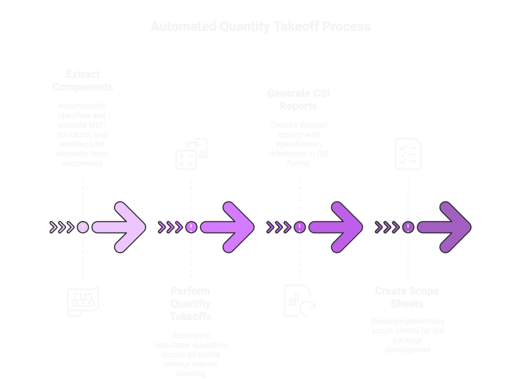 - Automatically extracts MEP components, structural elements, and architectural features from construction documents